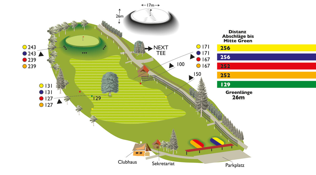 Tipp von Head Pro Adam Fisher: Dieses Par 4 ist nicht so einfach wie es aussieht, vermeiden Sie das "Out"an der rechten Seite und achten Sie auf den großen Baum links. Ein kleines Grün erwartet Sie auf einem "Gugelhupf".