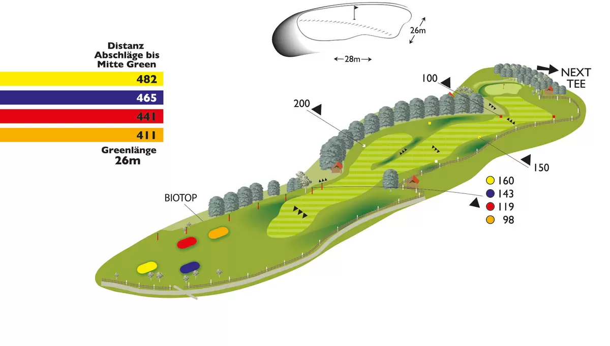 EIn Par 5, eines von insgesamt 5 auf unserem Golfkurs. Tipp von Head Pro Adam Fisher: Halten Sie sich mit Ihrem Abschlag rechts am Fairway, um den steilen Abhang links auszuweichen. Die Bäume an der linken Seite könnten Ihren Angriff auf das tiefer liegende Grün behindern.